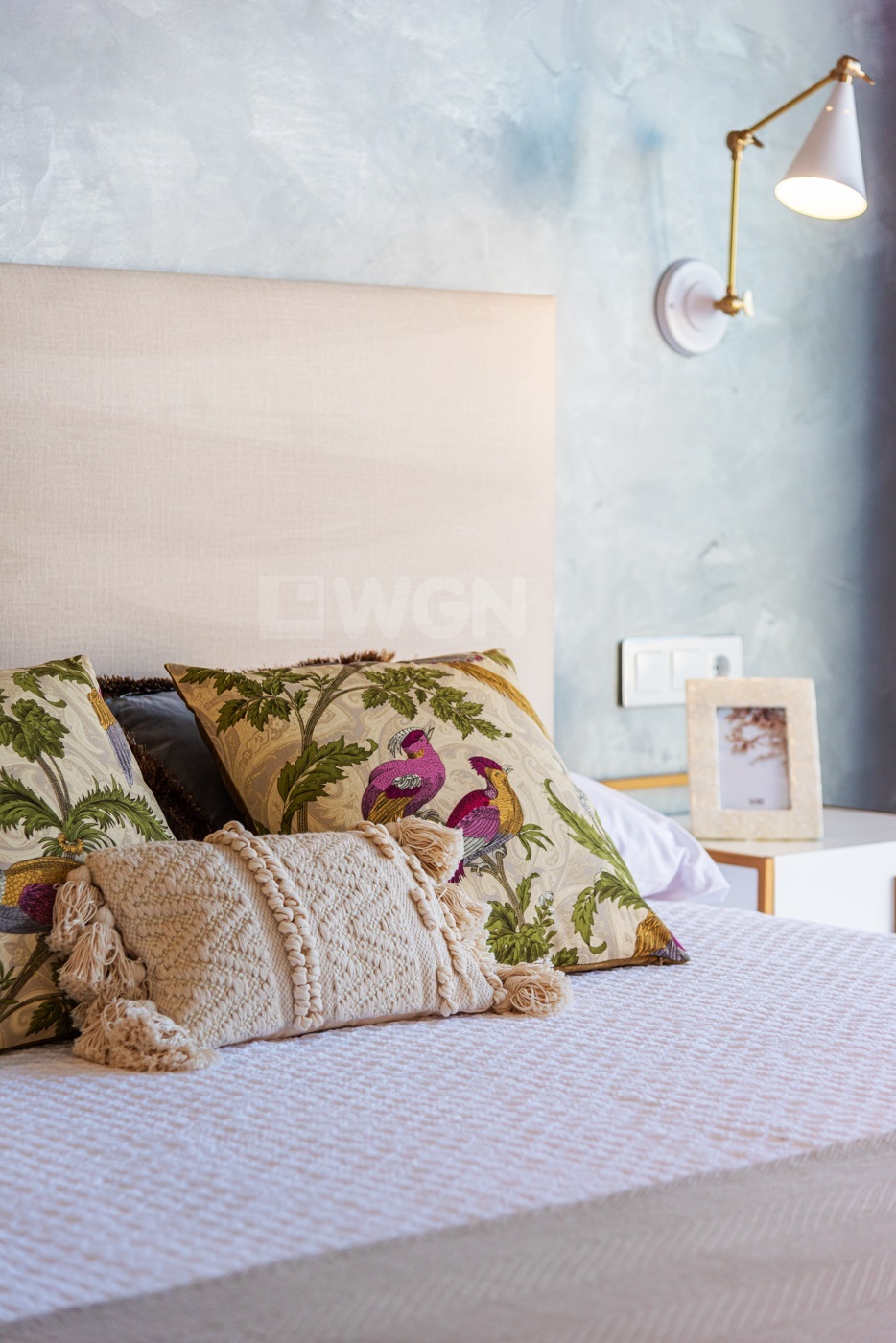 ♦ Wbudowane szafy wnękowe wyłożone tekstyliami, szuflady i oświetlenie LED