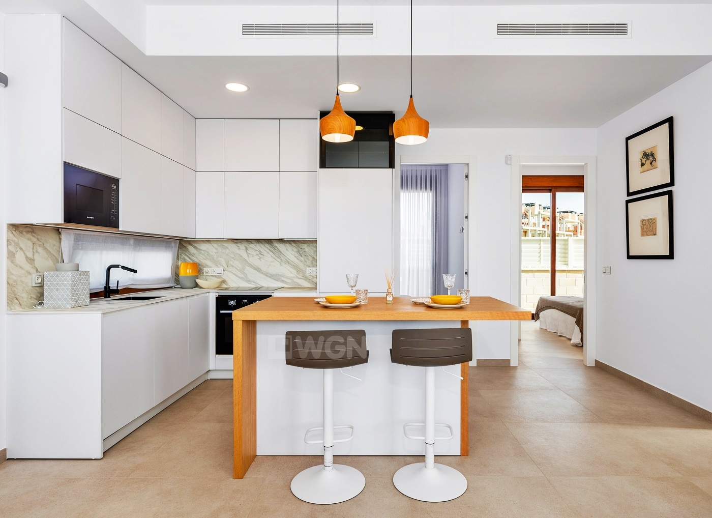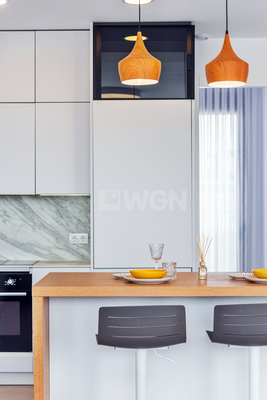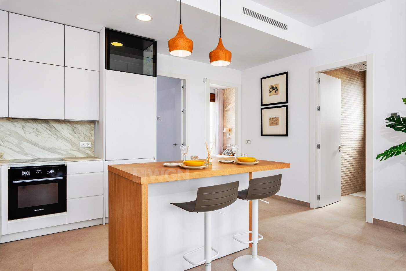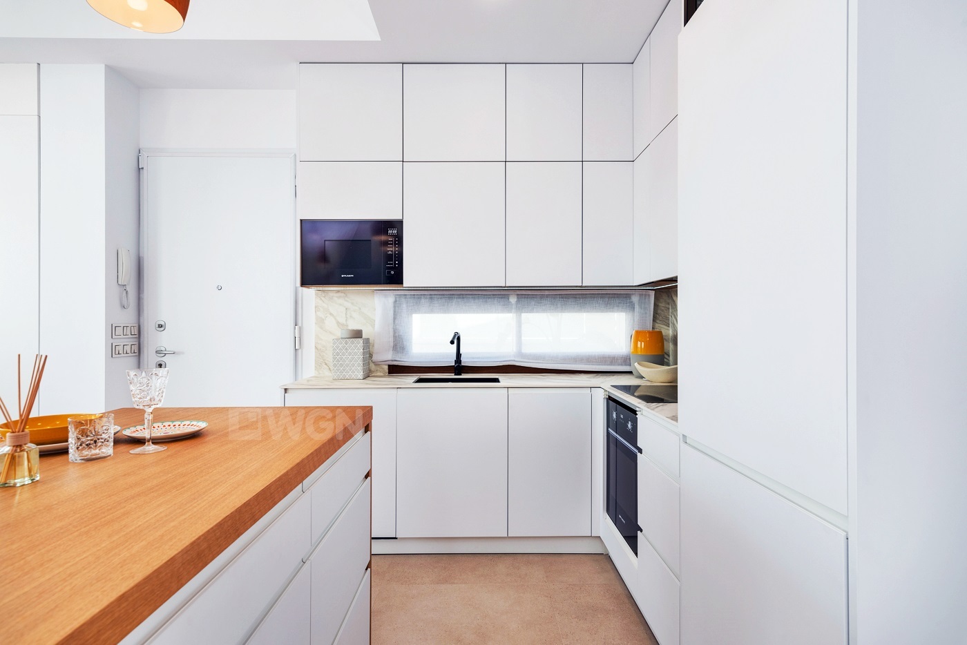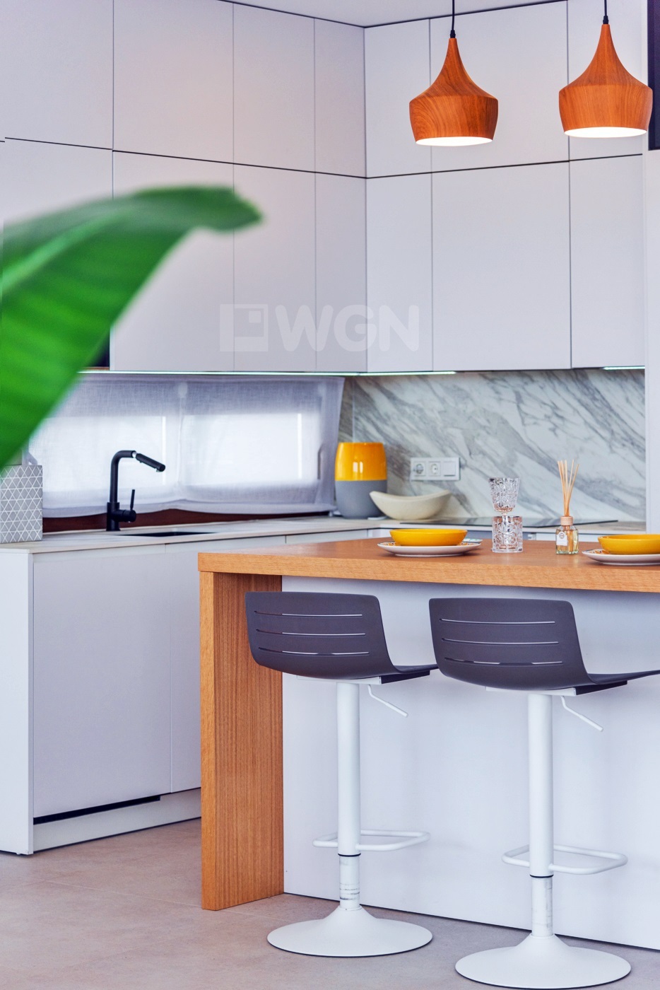 Nowoczesna, wyposażona kuchnia z blatem Silestone i oświetleniem LED.