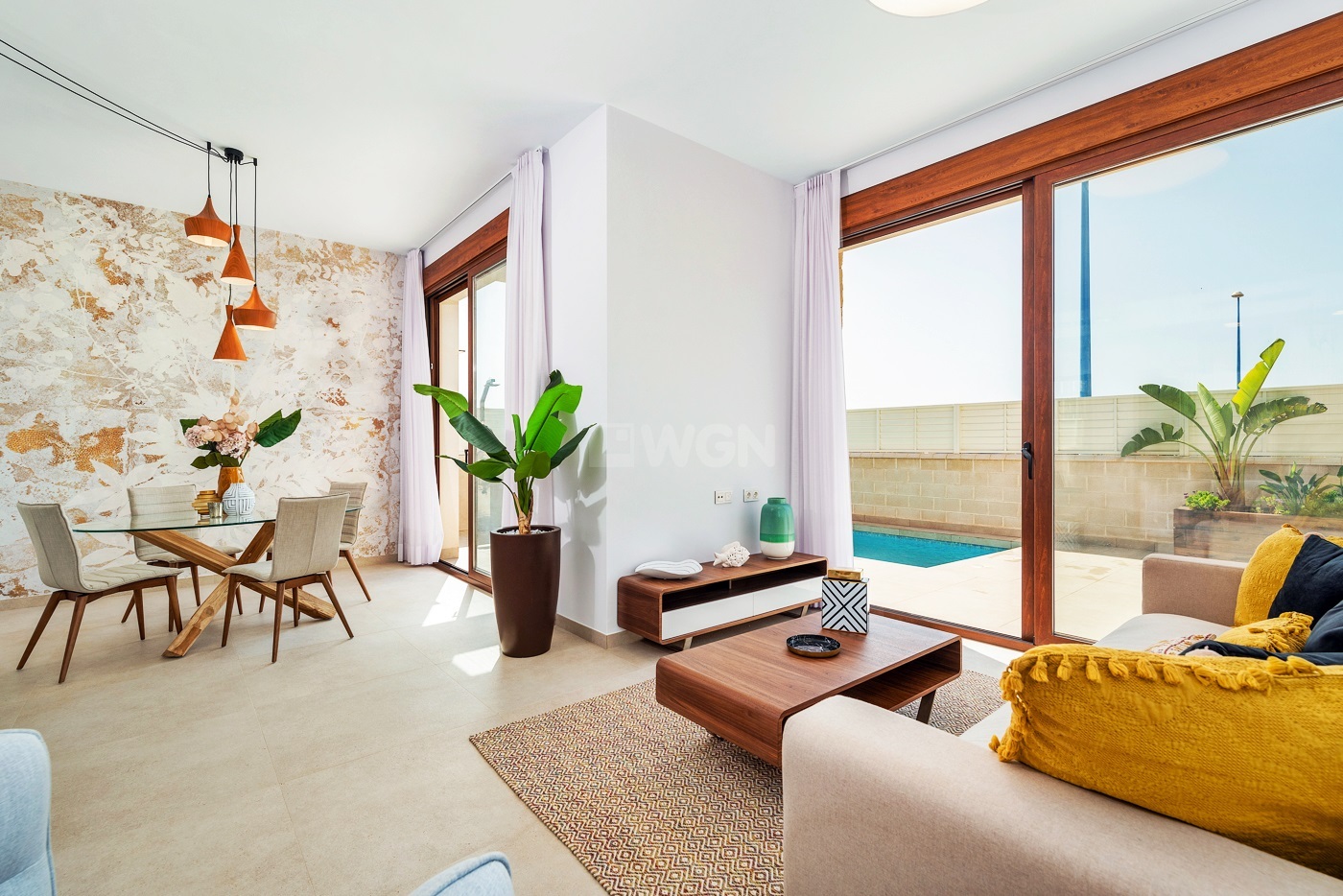 Otwarty salon-jadalnia z podwójnymi szklanymi drzwiami okiennymi.